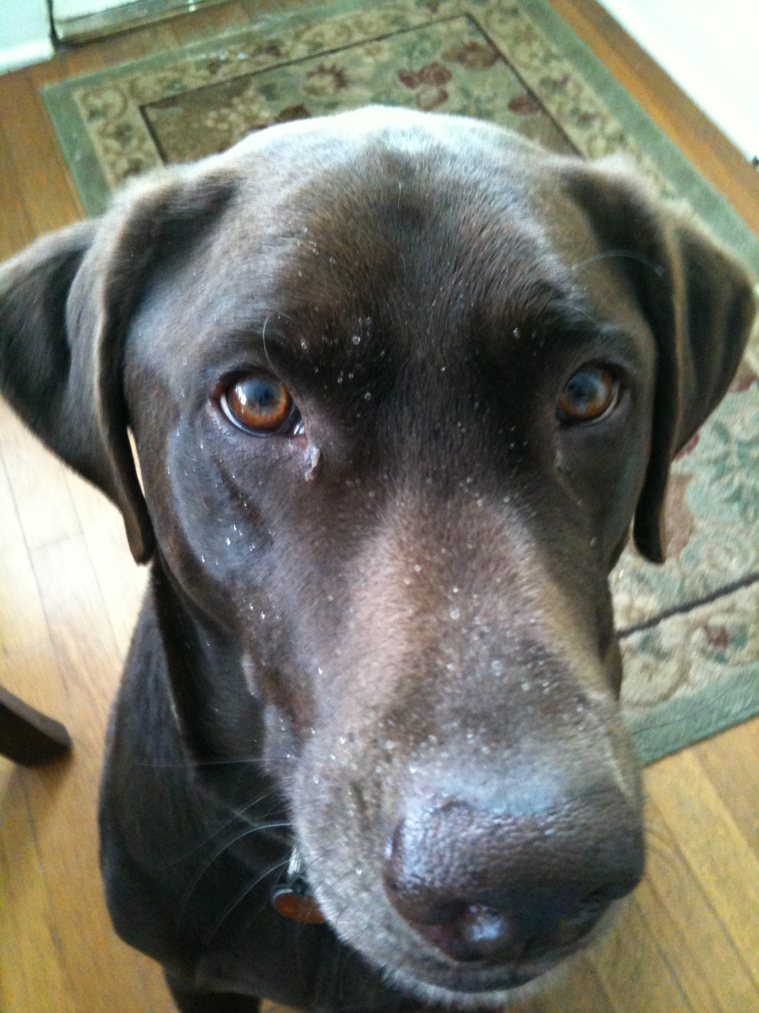 Here is a picture of the lab after he came in from playing in the snow this morning. His face was covered with snow, but by the time I got my camera for the picture it had started to melt, so it does not show up so well in this picture. He looks happy anyway.