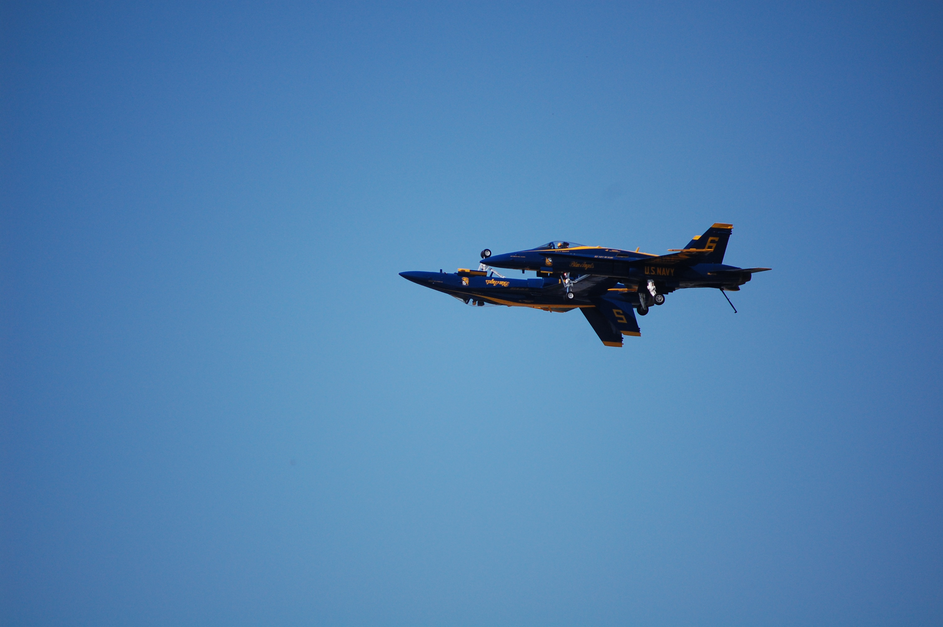 The Blue Angels fly 6 F-18’s, 4 of them in a 4-ship formation as shown above and 2 solo pilots that fly a combination of opposing and formation passes. You can tell from the photo above, the Blue Angels fly close together! They stay in tight formation through a variety of aerobatic maneuvers and sometimes even change formations in the middle of a maneuver.